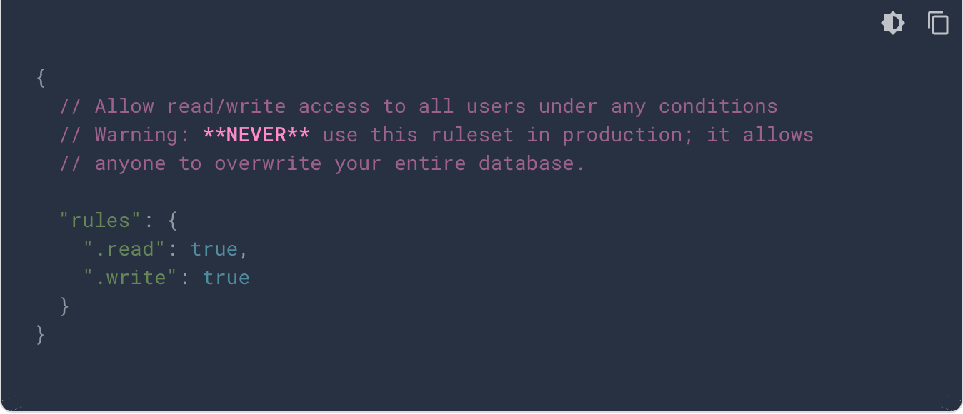 Firebase セキュリティルールとは、悪意のあるユーザからデータを保護するために利用されます。Firebaseコンソールで、全てのユーザに対してアクセスを拒否するロックモードと、全てのユーザに対してアクセス権を付与するテストモードを選択する事ができ、開発中はより自由な構成が必要となるようです。